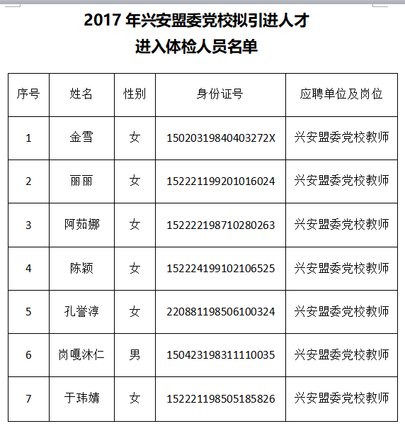 根据《2017年兴安盟委党校引进人才方案》,按照每个岗位应聘人员评估成绩 从高分到低分的顺序和该岗位计划引进人数,等额确定进入体检人选,现将进入体检人员名单及体检有关事宜通知如下: